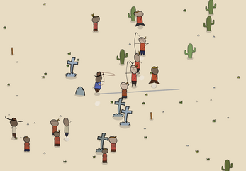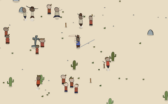 As the legendary Lasso Sheriff, you enter a new territory of the country. This is an "open world" – could be a simple minimap where you click to navigate to a village. There are places, bandit camps, and villages. These villages are captured by bandits and your goal is to free all villages in the game. You start with a basic short lasso and slowly gain upgrades (longer lasso, better boots for speed, nicer shirt for more lives, etc.) to progress in the game and tackle larger villages with more difficult enemies.